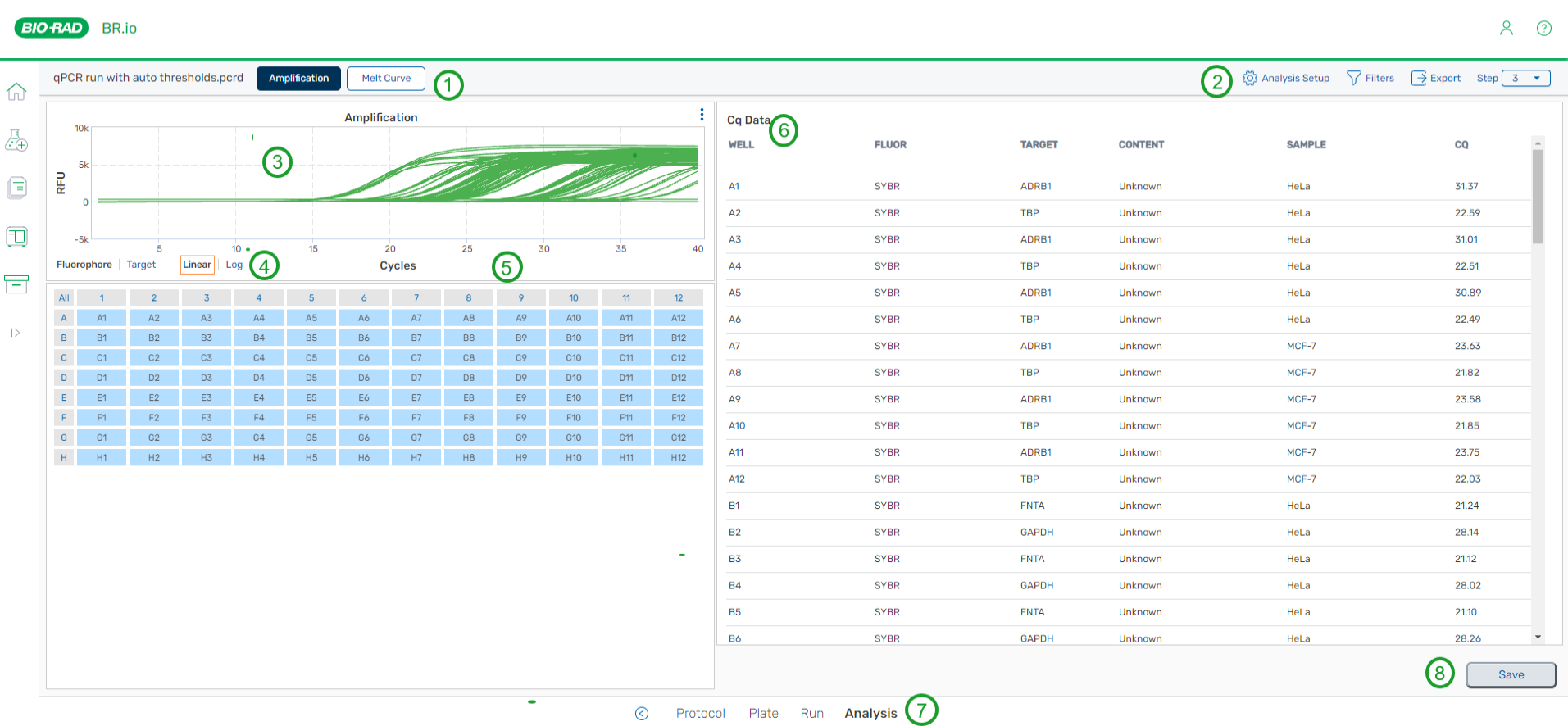 After the CFX run has finished, the instrument links the data collected during the run to the run file, and then updates the file to a completed run that opens in the Analysis page. From the Analysis page, you can review, analyze, and export data from the run.