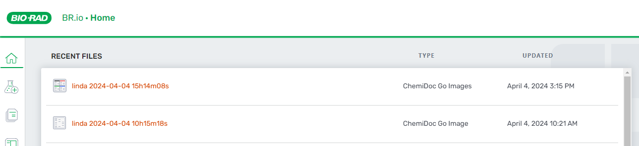 When you capture a multi-channel image on the ChemiDoc Go and export it to BR.io, the multi-channel icon appears next to the image. The .mscn file contains each image identified in the Image Lab Touch image panel. and is identified as ChemiDoc Go Images in the Type column. |
