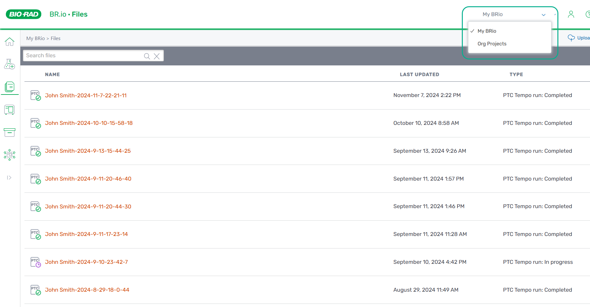 Note: If a user runs a PTC Tempo protocol on the instrument, the completed run will appear in the user's My BRio folder instead of the project folder after the run is completed. To share a completed run, users must move the completed run from their My BRio folder to the project folder.