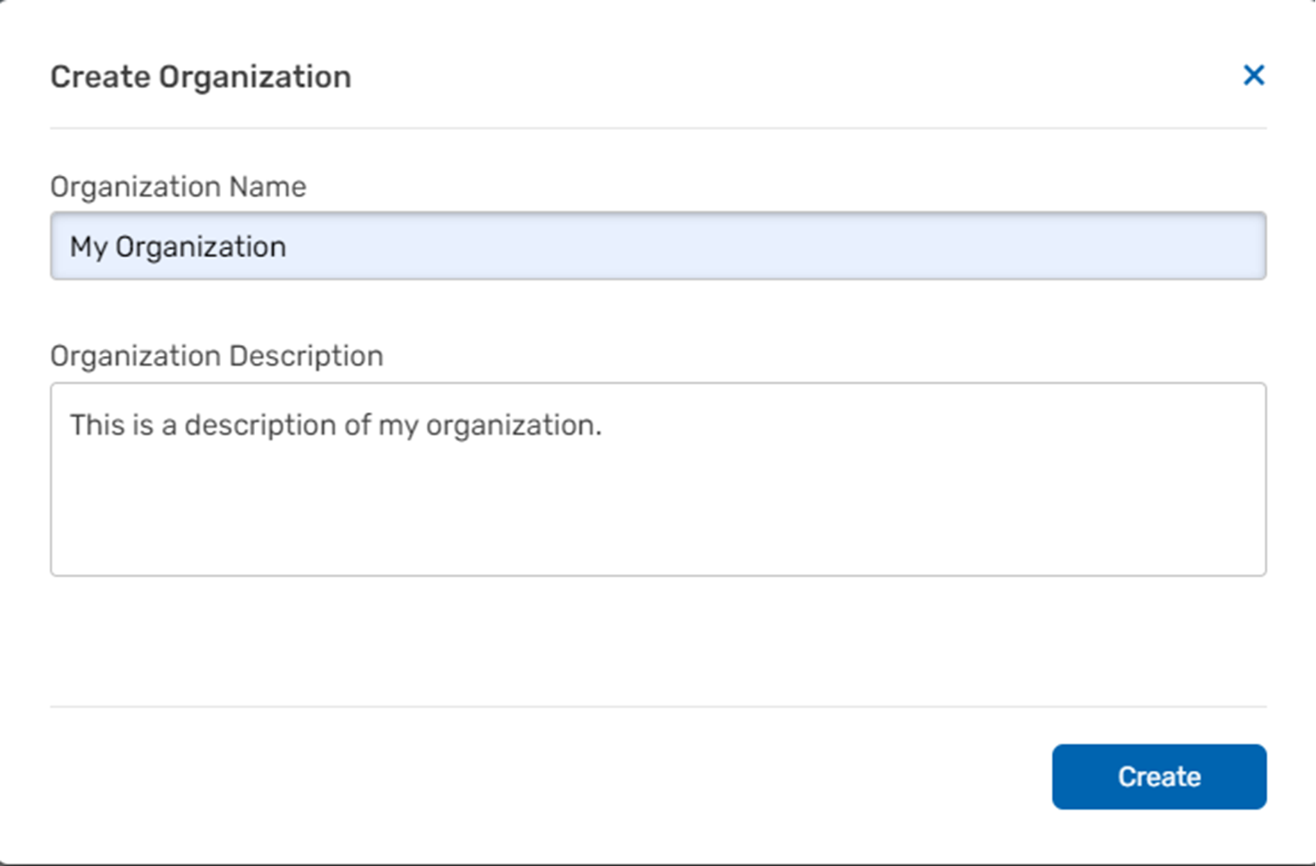 3. | In the Create Organization dialog, enter the organization name and the organization description. |
