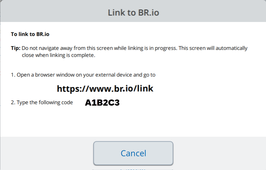 The Link to BR.io screen appears and displays a unique code to establish the link. The code is valid for 60 minutes after you tap the Link button on the instrument (Step 3).