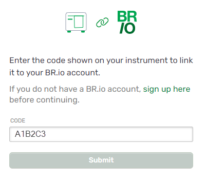 5. | In the BR.io code entry page, enter the code from the instrument and click Submit. |