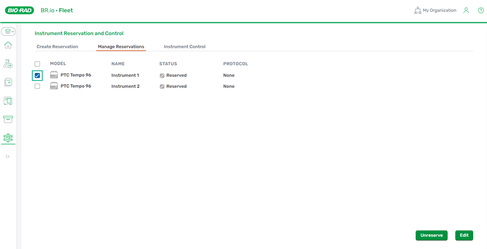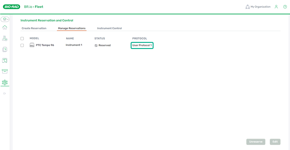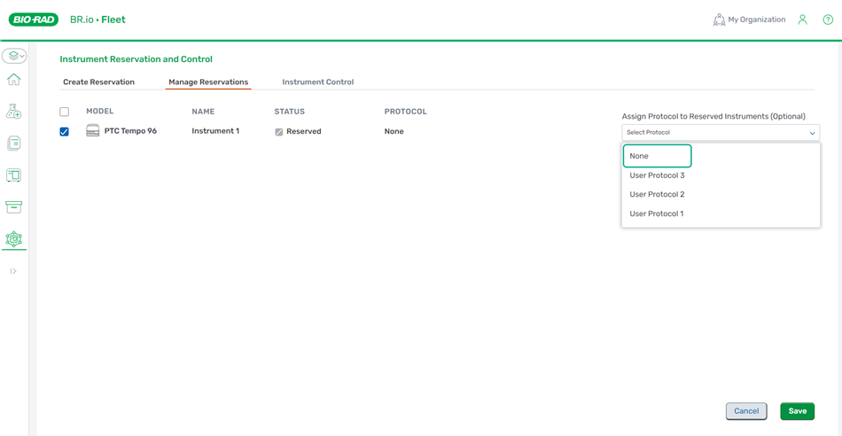 Important: Canceling an instrument reservation also removes a protocol assignment. You must reserve the instrument again to reassign the protocol.