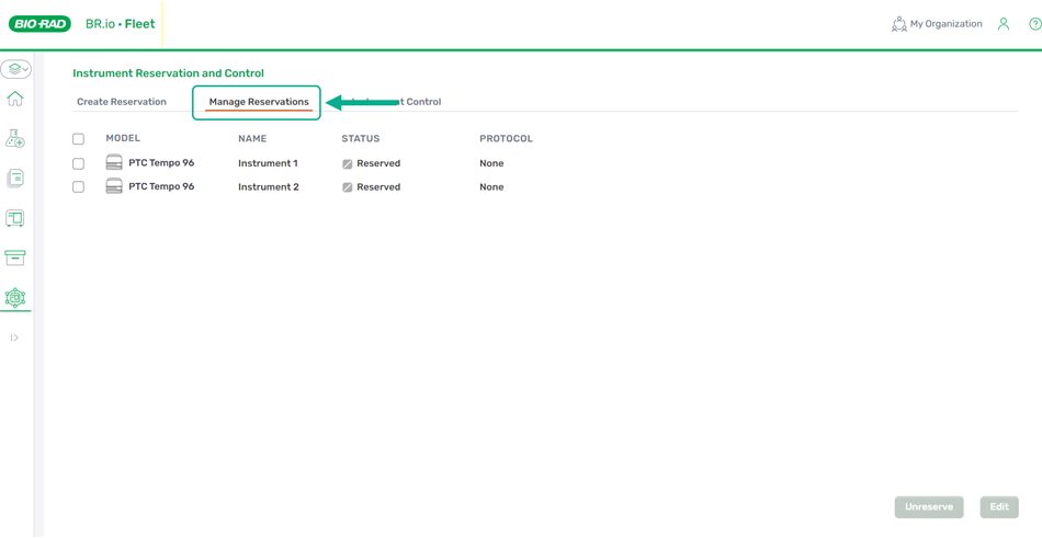 | 1. | From the Instrument Reservation and Control screen, navigate to the Manage Reservations tab. |