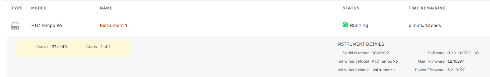 On the Instruments page, the instrument's status appears as running. The Instruments page also displays the protocol name as well as the run's cycle and step status. For more information about the instrument page, see Viewing Instrument Details.