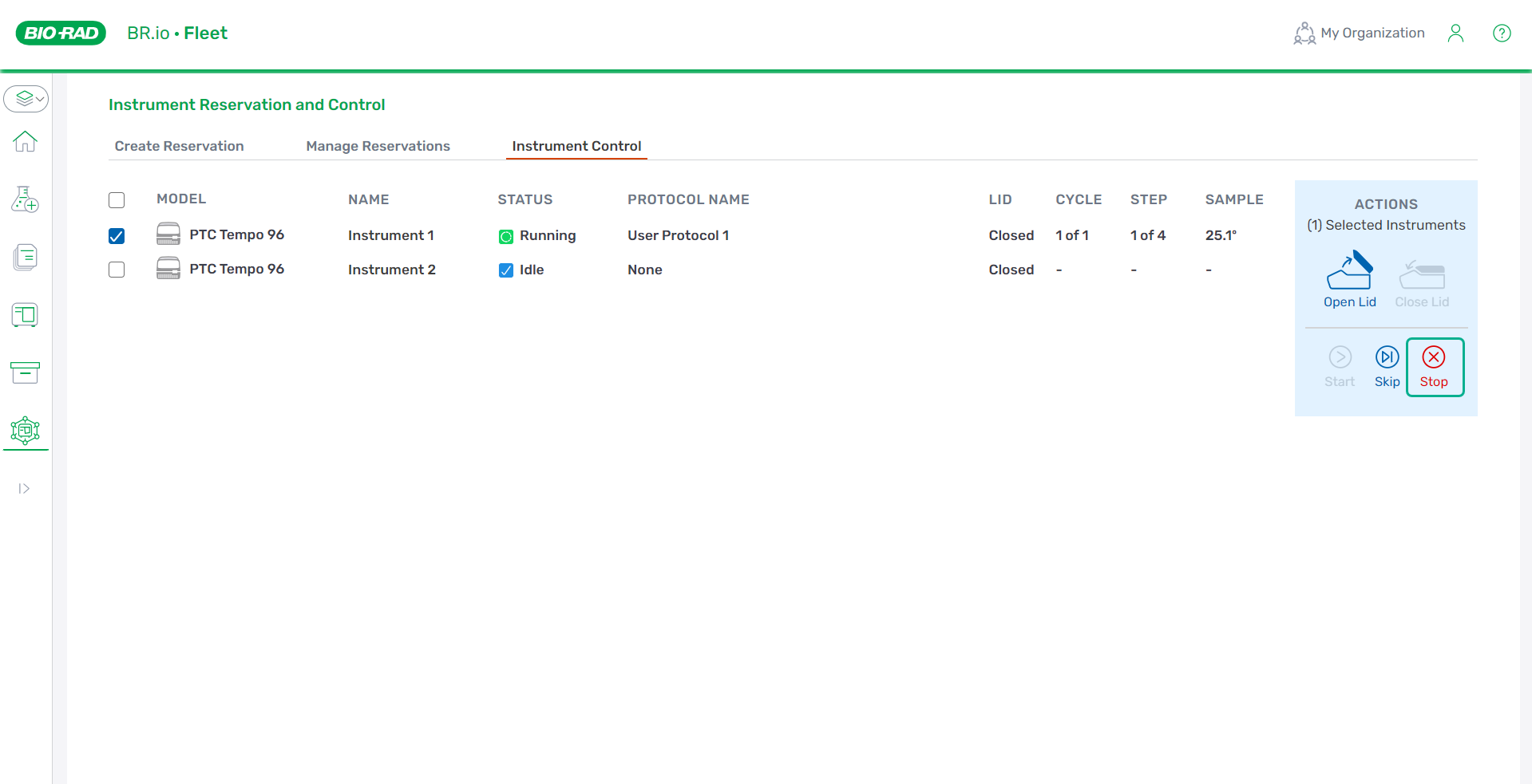 Important: Stopping an in-progress run removes the protocol assignment from the instrument. You must re-assign a protocol to the instrument(s) on the Manage Reservations page to start the protocol run again.