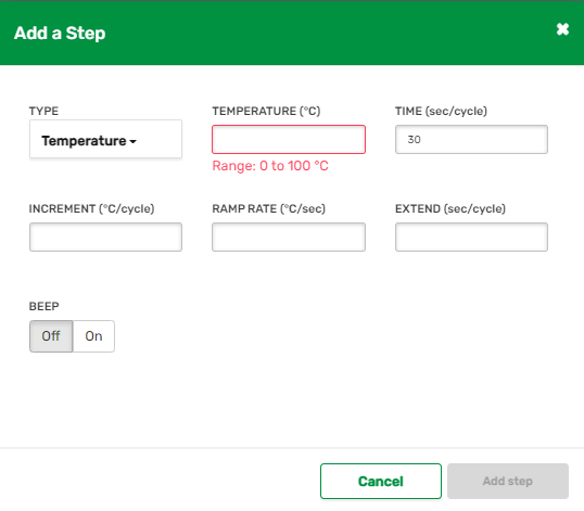 The Add a Step or Edit Step <X> dialog box opens to the default temperature step.